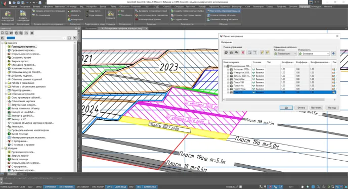 В месячном и годовом планировании используется комбинация фактических и проектных поверхностей. На профилях сопоставляются разные периоды отработки и будущие проектные контуры. Каждый расчет площади и объема проводится в разрезе конкретного пласта и уступа: четыре поверхности – кровля, подошва, фактическое и проектное положения – образуют основу для расчета материалов. Результатом становится полностью оформленная таблица объемов по каждому пласту и горизонту.