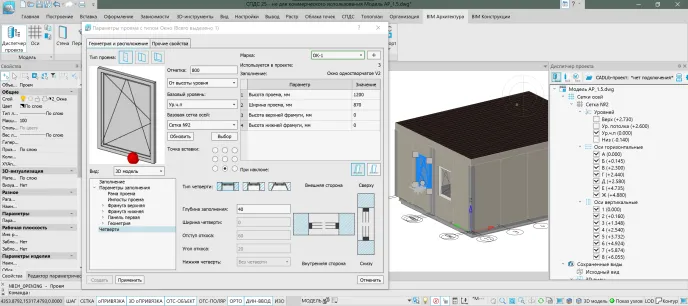 Установка проемов стала еще одним примером гибкости инструмента. При создании каждого окна и двери мы выбирали из обширной стандартной библиотеки заполнений. Для типовых проёмов этого более чем достаточно, но продукт также позволяет при необходимости создавать и настраивать собственные, нестандартные варианты.