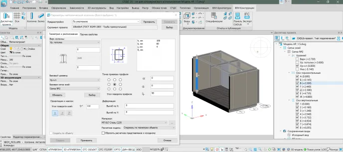 Работа с данным инструментом осуществляется через плавающий диалог, в котором можно выбрать сортамент металлопроката и задать: привязки верха и низа колонны к уровням, базовую сетку осей, ориентацию и наклон относительно вертикальной оси, точку привязки сечения, угол поворота профиля, выгибы по осям X и Y, материал, а также выбрать расчетное представление объекта.