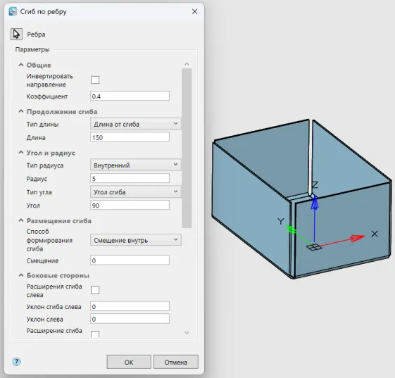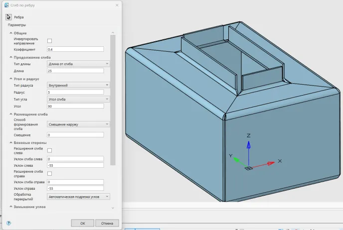 Для получения нужной геометрии используем параметры операции Сгиб по ребру, представленные на рис. 14.
