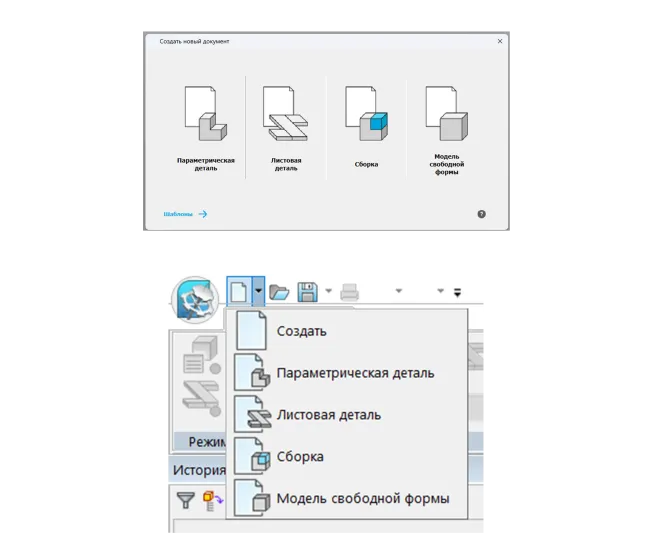 Рассмотрим моделирование деталей из листового металла в nanoCAD Механика PRO на примере корпуса прибора. Для начала работы необходимо создать новый документ, используя шаблон Листовая деталь, доступный в диалоге создания нового документа или в выпадающем списке пиктограммы Создать (рис. 1).