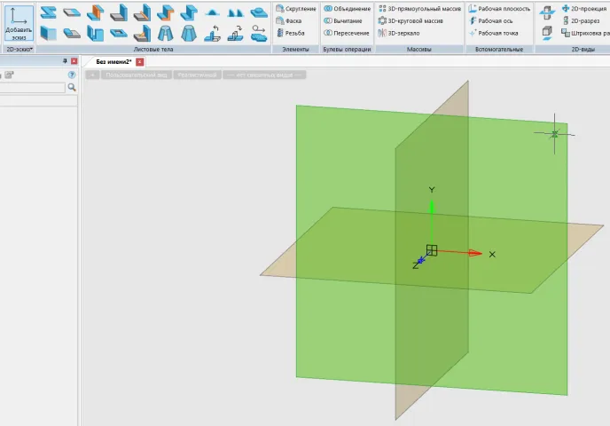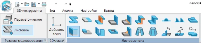 После создания документа по соответствующему шаблону в группе Режимы моделирования ленточной панели появляется активная пиктограмма Листовое, а в группе Листовые тела становятся доступными операции (рис. 2).
