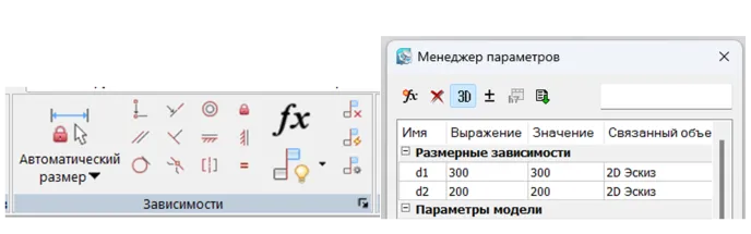 Для простановки размеров используем команду Автоматический размер в группе Зависимости. При создании размеров автоматически добавляются соответствующие выражения в Менеджере параметров, открыть который можно также из группы Зависимости (рис. 5). Как видно на эскизе, зависимости вертикальности и горизонтальности были наложены на прямоугольник автоматически.