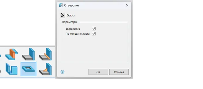 После завершения редактирования плоского эскиза вызываем команду Отверстие и выбираем для нее в качестве входных данных предыдущий эскиз. Устанавливаем чек-боксы Вырезание и По толщине листа (рис. 23).