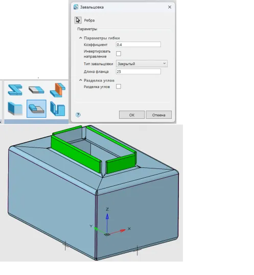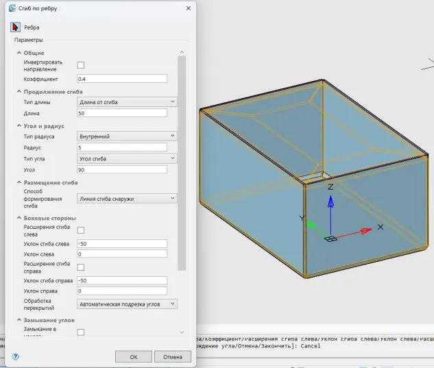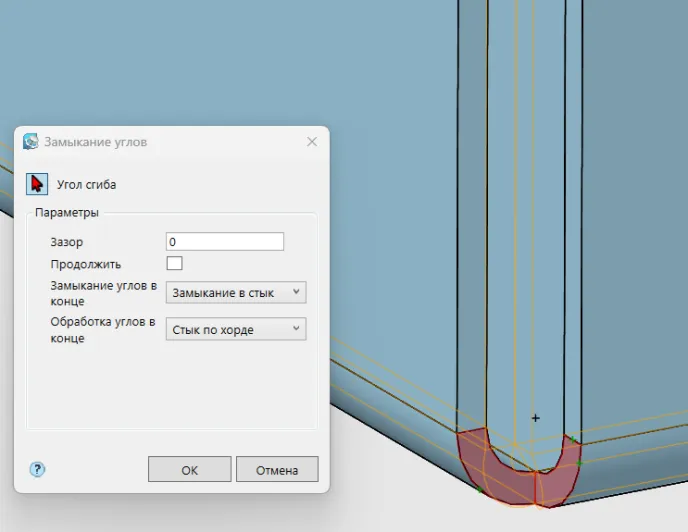Как мы могли заметить, в команде Сгиб по ребру также присутствует возможность создания замыкания углов, но в текущем примере мы специально сделали это отдельной операцией.