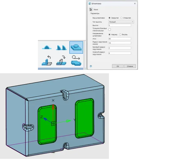 Завершим редактирование плоского эскиза, перейдем к команде Штамповка (рис. 18) и установим необходимые параметры. В качестве входных данных используем созданные в эскизе на предыдущем шаге.