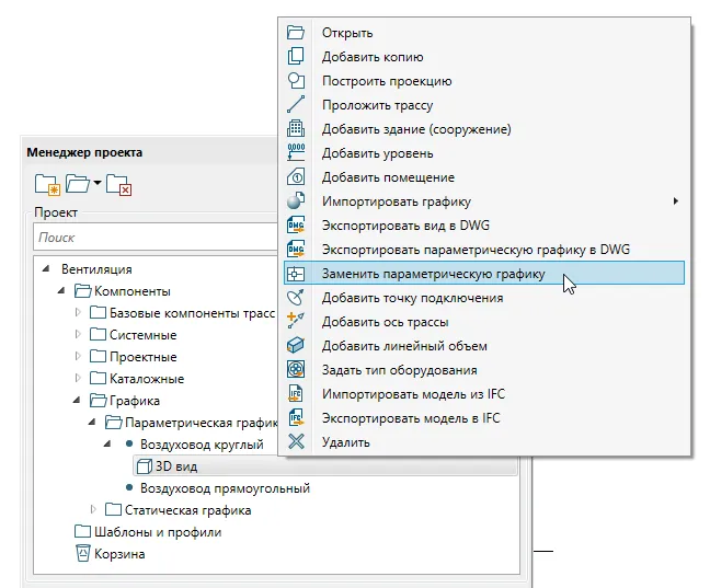 Обновить существующую параметрическую dwg-графику можно в один клик. Опция доступна в контекстном меню вида компонента «Параметрическая графика».