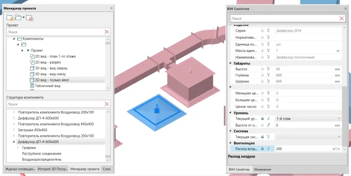 Оптимизировано поведение свойства «Расход воздуха»: теперь оно автоматически появляется во всех экземплярах компонентов с опцией «Воздухораспределитель». Это упрощает создание типовых узлов с заданным расходом воздуха на воздухораспределителях.