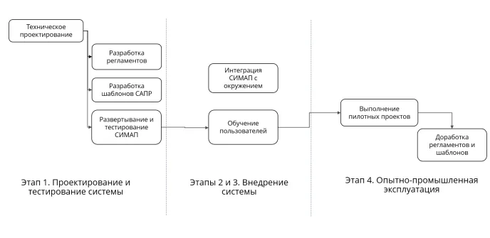 Процесс внедрения системы информационного моделирования и автоматизированного проектирования (СИМАП) разделен в компании на четыре основных этапа, которые реализуются последовательно.