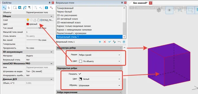 Разделы Параметры ребер и Перекрытые ребра отвечают за отображение видимых и скрытых ребер соответственно. Причем цвет ребер По объекту управляется через свойства элемента (см. рис. 13). Значение Изолинии можно увидеть на цилиндрическом или конусном объекте.