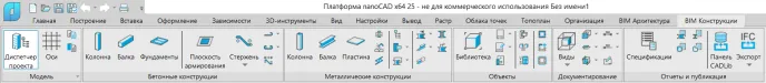 Основные операции с древесиной происходят в разделе Металлические конструкции (конфигурация «Конструкции»), поскольку данный материал имеет схожую специфику работы. Кроме того, могут использоваться другие разделы данной конфигурации, которые отвечают за работу внутри модели, формирование проектных документов, работу с объектами для проектирования бетонных конструкций, создание параметрических объектов.