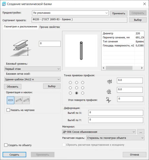 Теперь выберем размер. Для построения примера понадобится бревно диаметром 220 (рис. 5) по ГОСТ 2695-83. Задаем ему соответствующий материал (рис. 6).