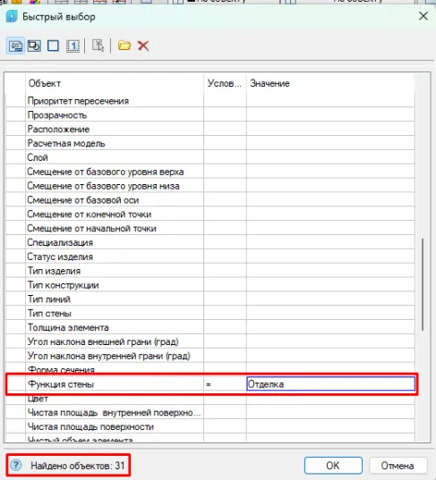 Воспользуемся поиском в текущем листе и зададим тип объекта «Стена». Когда тип объекта задан, окно быстрого выбора заполняется параметрами этого типа объектов. Необходимо найти параметр Функция стены, задать этой функции условие «=» и выбрать значение Отделка. Таким образом в нашу выборку попадут только те объекты, которые мы использовали в качестве слоев отделки. После этого команда сообщит нам количество объектов, подпадающих под выставленное условие (рис. 29).
