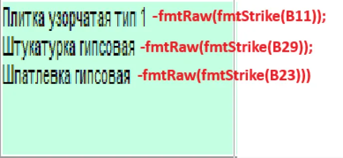 Из не использовавшихся ранее выражений здесь присутствует выражение fmtStrike. Функционал языка Diesel позволяет в таблицах выносить это выражение значения текста на новую строку внутри ячейки, однако он также формирует зачеркнутый вид строки. Следует заключить данное выражение в еще одно: fmtRaw – это позволит вернуть зачеркнутый текст в обычный формат (рис. 41);