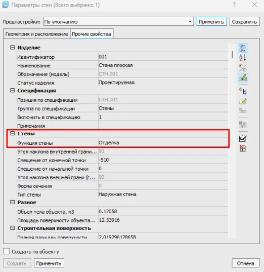 После внесения основных параметров расположения и отображения следует дополнительно настроить свойства стен, чтобы в дальнейшем была возможность задать условия отбора объектов. Переходим на вкладку Прочие свойства, находим группу параметров Стены и изменяем параметр Функция стены на значение Отделка (рис. 6).