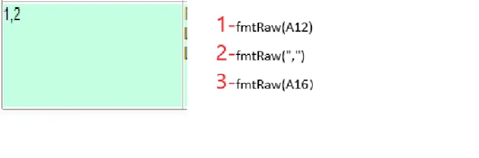 1 – в первую ячейку вписываем формулу, щелчком ПКМ по ячейке вызываем контекстное меню и выбираем команду Выражение. Происходит переход в окно построения выражений ячейки, куда мы заносим следующее выражение: «=fmtText(fmtRaw(A12);fmtRaw(",");fmtRaw(A16))». Выражение такого вида создает текстовую строку с помощью выражения fmtText, а каждое значение fmtRaw заносит текстовое значение из ячейки либо из текста в формате " ". Полученная ячейка показана на рис. 40;