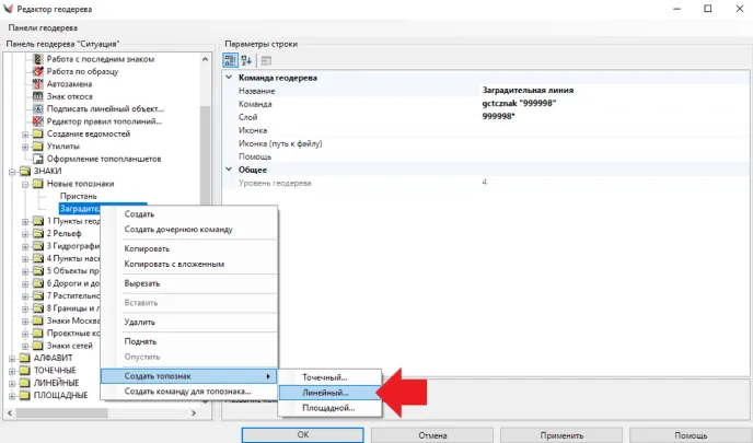 Теперь создадим линейный УТЗ. Для этого повторим ту же процедуру, которую мы делали для точечного УТЗ раньше: вернемся в Редактор, создадим Дочернюю команду, дадим ей название – Заградительная линия, пропишем саму команду gctcznak «999998» и, нажав на ней ПКМ, Создать топознак, Линейный... (рис. 14).
