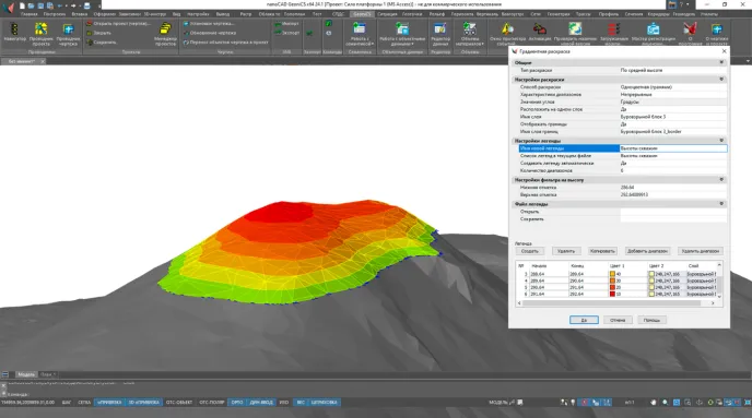nanoCAD GeoniCS используется и для технического контроля. Маркшейдеры отслеживают соответствие фактических работ проектным поверхностям, контролируют продольные уклоны дорог, углы откоса и положение рабочих контуров.