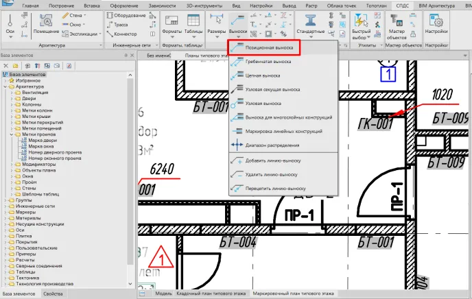А что делать, если марка для BIM-объекта нужна с полкой и выноской? В этом случае создадим свою выноску и сохраним ее в базе элементов для повторного использования.