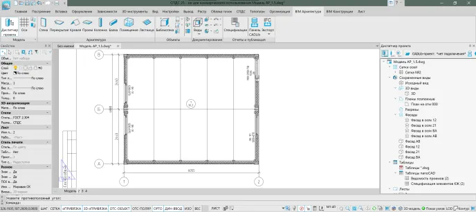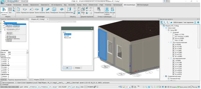 Основным итогом пилотного проекта стало успешное выполнение полного цикла проектных работ в nanoCAD BIM Строительство на реальном объекте. Компактность здания позволила сконцентрироваться на детальном освоении ключевых принципов работы программного продукта — от использования системных инструментов до построения параметрических элементов ограждающих конструкций и автоматизированной генерации комплекта рабочей документации.