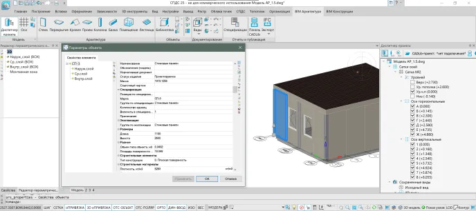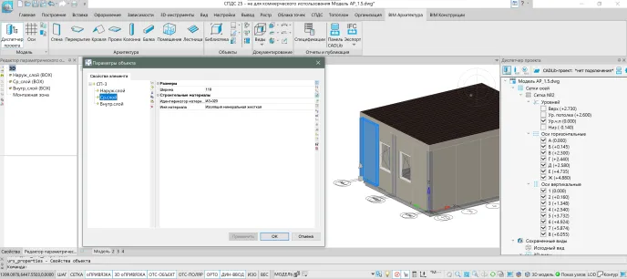 Предприятие «СПЕЦ Прожект групп» (Бронезавод «АПИТ»), при проектировании и производстве модульных зданий, периодически сталкивается с необходимостью решения вопросов интеграции архитектурно-конструкторских решений проектируемых модульных конструкций с существующей компоновкой инженерных систем особенно на ранних стадиях проектных работ для исключения коллизий. Ключевым требованием была скорость адаптации типовых проектов под нужды конкретного технического задания (ТЗ) и минимизация ошибок при передаче данных между смежными отделами. Для организации проведения пилотного проекта был выбран типовой блок-модуль общественного назначения габаритами 6x4,9 м. с реализацией проектирования на базе программного обеспечения nanoCAD BIM Строительство — продукт российской компании «Нанософт». Его компактность и типовая структура идеально подходит для отработки методики создания параметрических библиотечных элементов, как последующей основы для проектирования иных модульных зданий из линейки, выпускаемых предприятием.