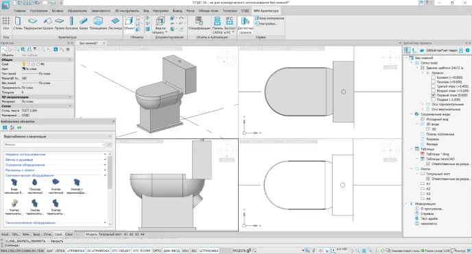 Объекты библиотеки имеют 2D- и 3D-представление и корректно отображаются в объемной модели и на плане.