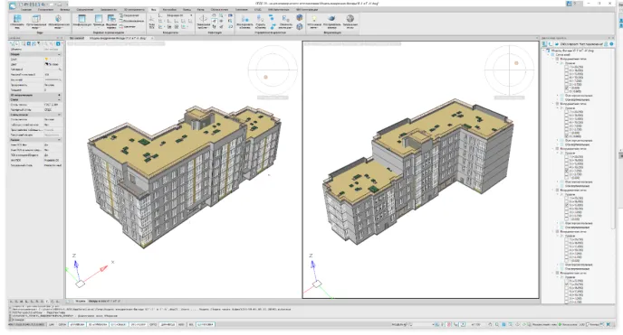 Модели остальных этажей и кровель на разных отметках выполнены корректировкой модели типового этажа в копиях ее файлов.
