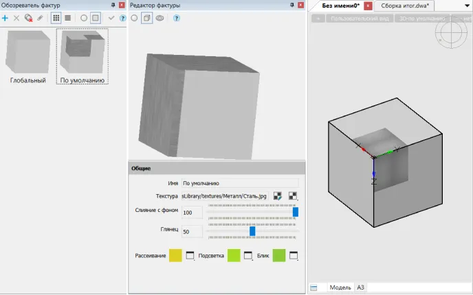 Обозреватель фактур – это настройка цвета и текстуры поверхности объекта и назначение ее на отдельный объект через параметр материала. У разных необъединенных объектов может быть назначены разные материалы.