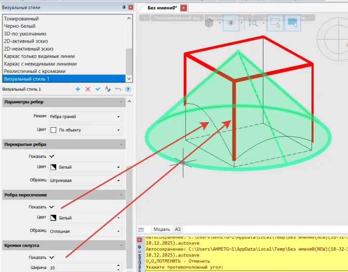 В параметрах Ребра пересечения и Кромки силуэта настраивается отображение линий пересечения тел и толщина линий видимых ребер. Для примера на рис. 14 представлено пересечение куба и конуса. Объединение тел не производилось.