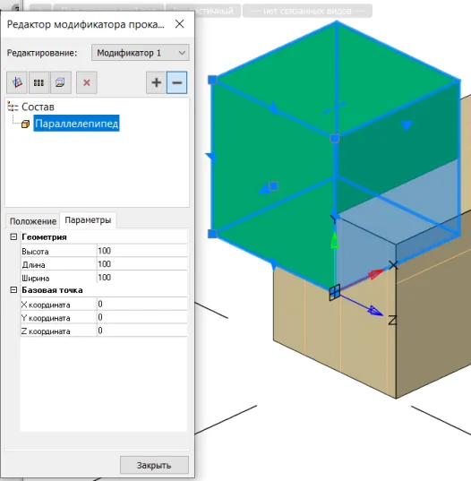 При выборе этого объекта он автоматически принимает размеры 100×100×100 мм и добавляется к текущей балке. Чтобы вычесть объект, следует нажать на знак «минус» в окне редактора модификатора. Полученный куб и его параметры показаны на рис. 34.