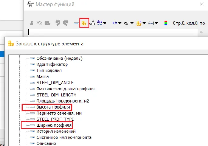 В появившимся окне можно вписывать известные формулы или задавать параметры. Чтобы выбрать любой из них, необходимо задать Запрос к структуре элемента (рис. 37) и выбрать подходящее свойство. В таком случае будут представлены не только сам параметр, но и указание к параметру внутри элемента.