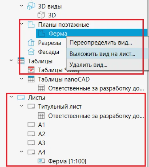 Полученный вид можно разместить на листе, щелкнув по виду правой кнопкой мыши и выбрав команду Выложить вид на лист (рис. 28). При выкладке в разделе Листы будут показаны все виды, которые лежат на том или ином листе. Настройка спецификаций выполняется аналогично настройке спецификаций для металлоконструкций.