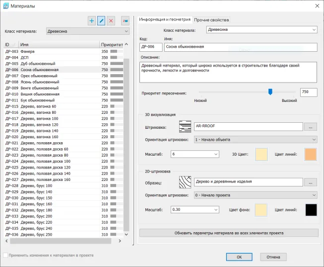 Выбор материала осуществляется в соответствующей библиотеке (рис. 7), где есть возможность воспользоваться готовым вариантом либо создать свой собственный. Новый материал можно формировать с нуля или на основе существующих. Все необходимая информация по тематике деревянных конструкций располагается в классе Древесина.