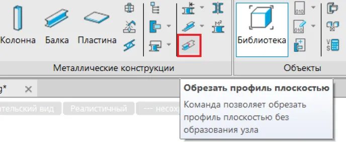 Помимо применения динамических булевых операций, можно воспользоваться Обрезкой профиля плоскостью – эта функция располагается в разделе Металлические конструкции (рис. 25).