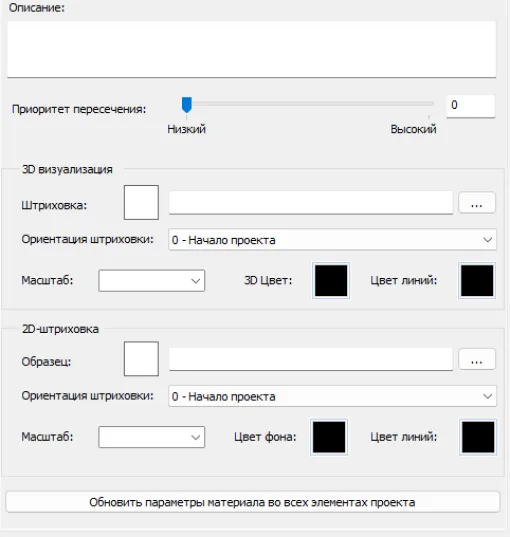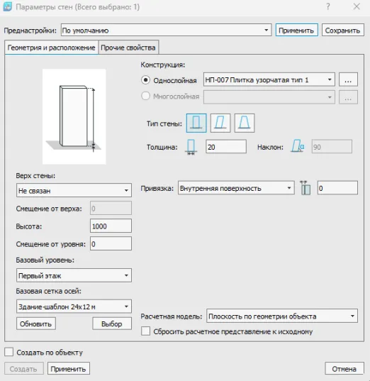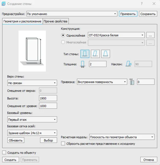 1 – вкладка Конструкция окна Создание стены позволяет настраивать материалы стен, их отображение в модели, а также приоритеты подрезки.