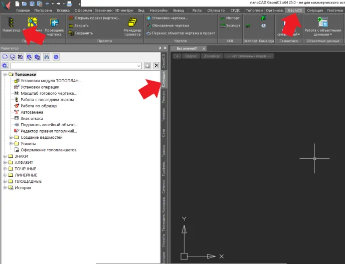 УТЗ в nanoCAD GeoniCS находятся исключительно в панели Навигатора, в закладке Ситуация. Сам навигатор можно открыть, кликнув по нему на вкладке GeoniCS (рис. 1).