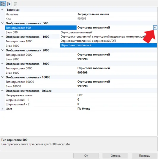 Если вы указываете тополинию, то, как и в случае с точечным УТЗ, наведя курсор на поле для выбора, как отрисовывать УТЗ (у меня в этом поле отобразился код знака 999998), выбрав 3 точки, мы попадаем в выбор правил, из которого можно выбрать заготовленный тип тополинии (рис. 16).